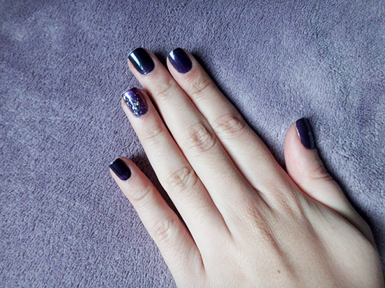 Para conseguir com que a cor Hippie Rua da Impala ficasse bem escura, tive que passar três camadas de esmalte. Na filha única utilizei o Roxo Metálico da Colorama e finalizei passando duas leves camadas do Glitter Disco Ball.