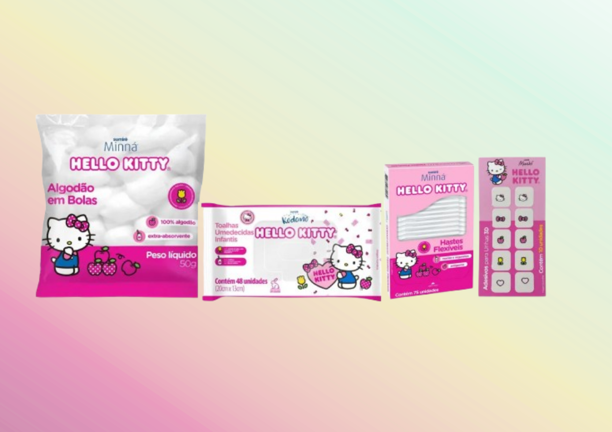 A linha, desenvolvida com exclusividade para a Sumirê, traz  quatro produtos  para  os cuidados diários e rotina de beleza, como o algodão em bolas 100% algodão e extra absorvente, ideal para remoção de maquiagem e cuidados com a pele; as toalhas umedecidas infantis, com fórmula suave e embalagem prática contendo 48 unidades; as hastes flexíveis, perfeitas para pequenos retoques de maquiagem e higiene; e os adesivos para unhas, que adicionam um toque divertido e delicado ao visual. Cada item foi cuidadosamente elaborado para oferecer praticidade, maciez e encantamento, transformando os momentos de cuidado em verdadeiros instantes de bem-estar. As embalagens trazem a estética icônica da Hello Kitty, com uma paleta em tons de rosa, branco e detalhes em lilás, laços e ilustrações encantadoras, em harmonia com a identidade visual moderna e acolhedora da Sumirê.